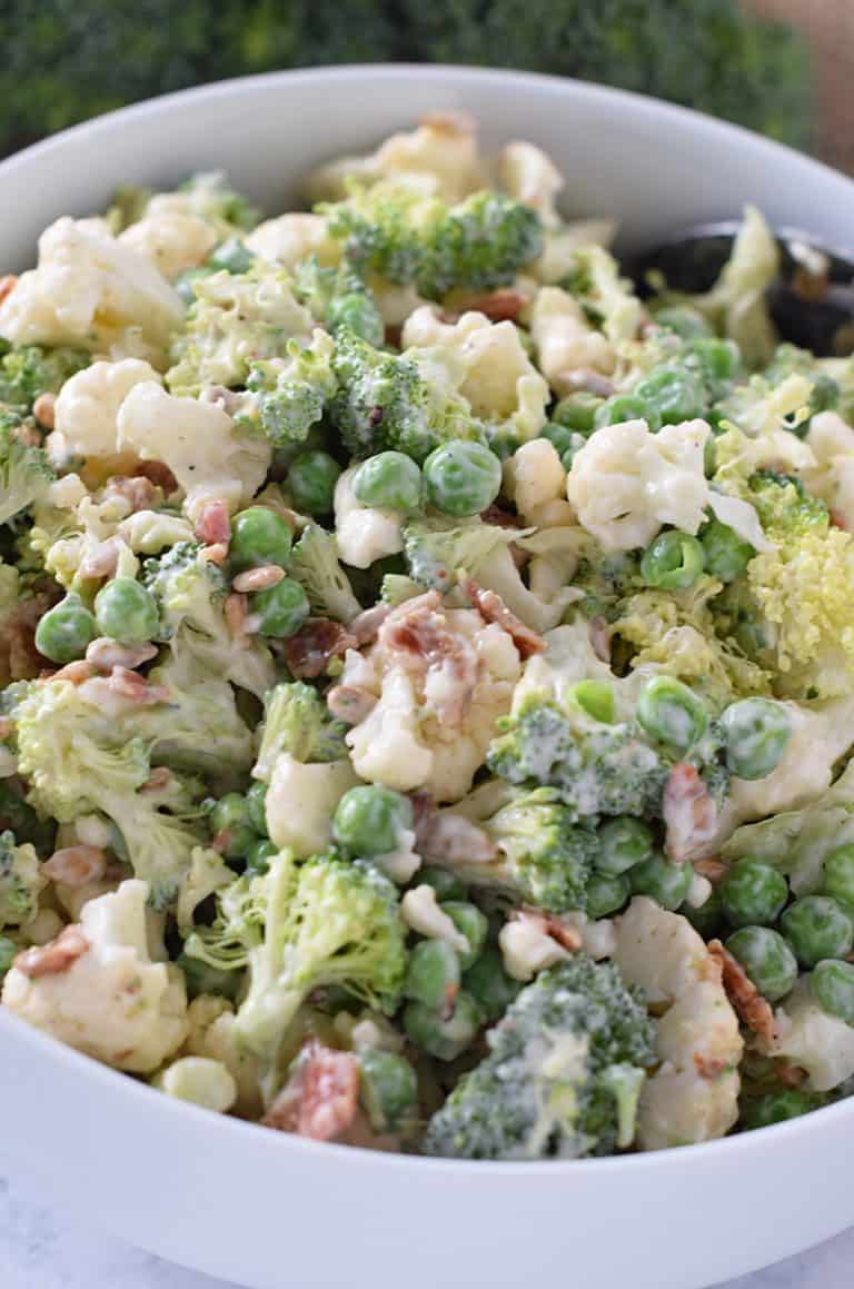 Classic broccoli salad, the perfect dish for a potluck, is updated with cauliflower, bacon and a sprinkle of crunchy sunflower seeds in this so-easy recipe that's sure to Whisk mayonnaise, mustard, vinegar, garlic, sugar and pepper in a large bowl.