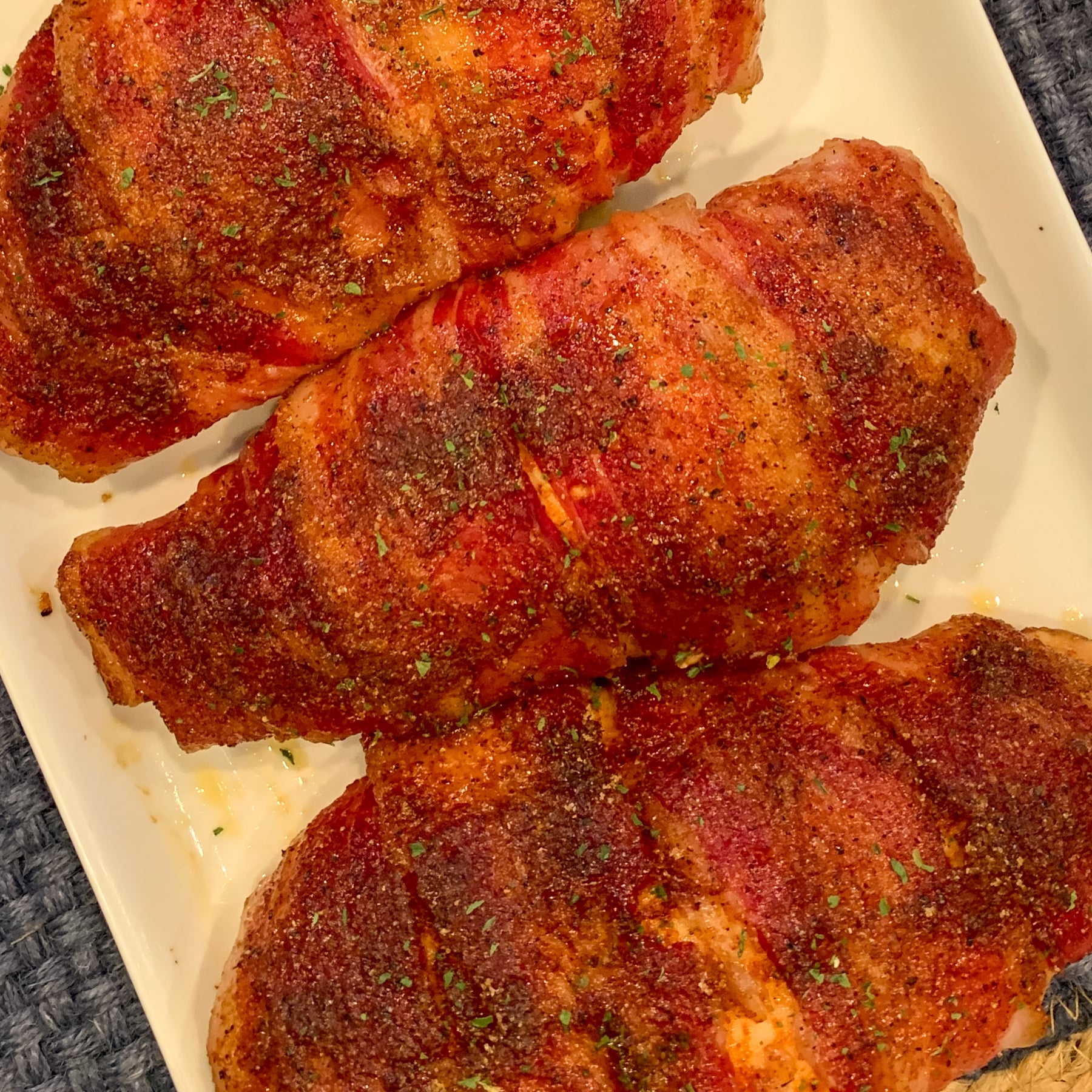 Wrap the bacon around the chicken breasts and secure with a toothpick. Reviewed by millions of home cooks. Cubes of chicken wrapped in bacon and coated with brown sugar, chili powder, and cumin?